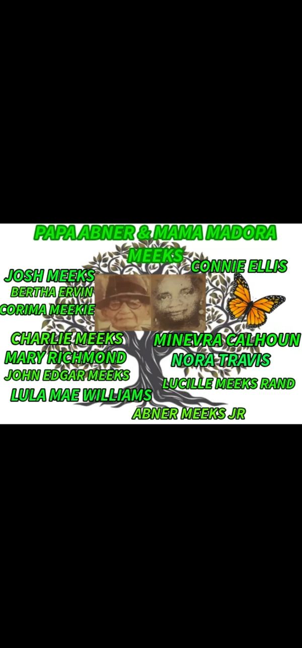 To this union 14 children were born. 2 died in infancy. Although, they now were parents of 12 children, they also raised a grandson, Willie "Joe" Meeks. They raised 13 children. All have gone home to Glory, their presence is always felt, especially when we gather together. WE HONOR THEM ALWAYS!!! Joshua (1981), Bertha Ann (1987), Abner (1991), Mary (1991), Lula (1994), Charlie (1995), Cormia (1997), John Edgar (1998), Lucille (2000), Connie (2006), Joe (2005), Nora (2012), and Manervia (2016).